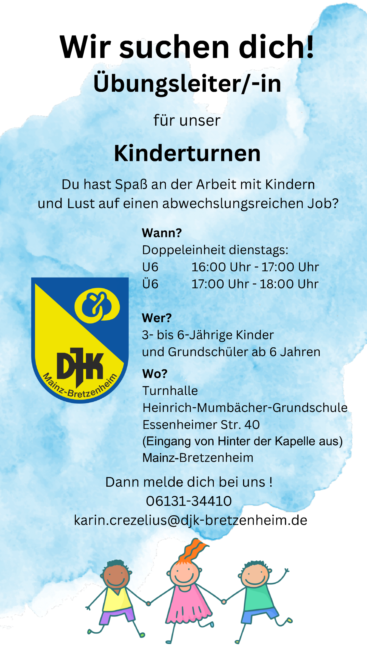 DJK Spvvg. Mog. Mainz-Bretzenheim e.V. sucht Übungsleiter*innen für eine Gymnastikgruppe RückenFit, donnerstags von 18 bis 19 Uhr und für eine …mehr